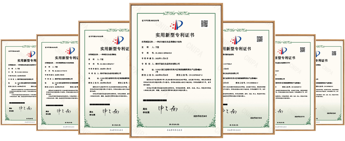 經過多年的研發創新,湖州開森現擁有【一種便攜式散粉盒結構】、【一種多功能化妝品易揭紙卡結構】、【一種方便攜帶的紙卡式粉餅結構】、【一種雙腔混合擠出型化妝品易撕包】、【一種雙腔掰折擠出型化妝品掰折打開片】、【一種單腔掰折擠出型化妝品掰折打開片證書】等多種專利,可以根據客戶的不同需求,進行深度創新,滿足市場和產品日益更新的需求。